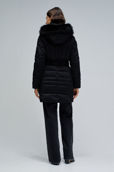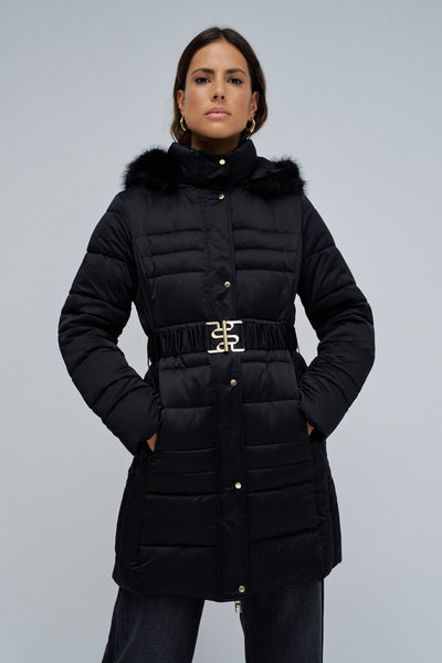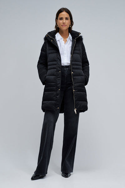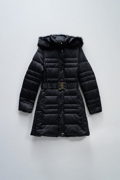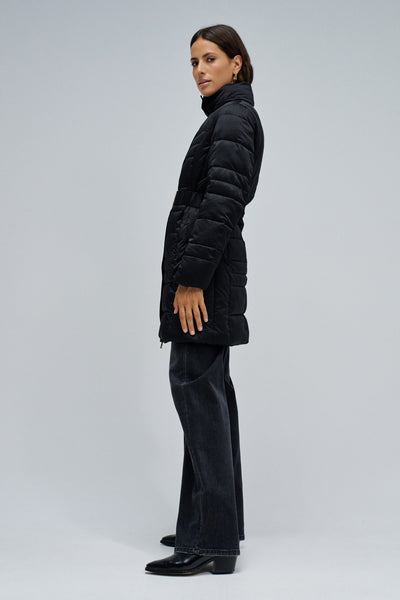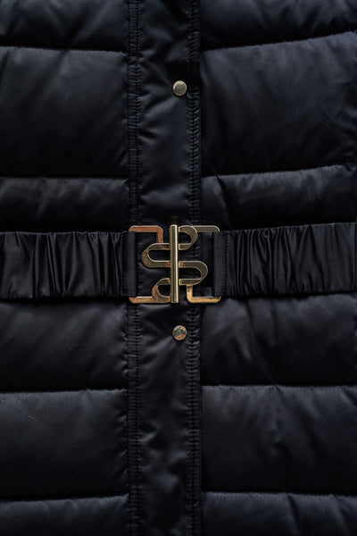 Elegante y funcional, esta chaqueta negra de corte slim combina estilo contemporáneo con materiales sostenibles. Con relleno de Repreve® proveniente de materiales reciclados, ofrece aislamiento térmico sin comprometer la ligereza. El diseño incluye capucha y cinturón desmontables con detalle de branding, permitiendo diferentes formas de uso. La apertura frontal con cierre de cremallera oculto y botones de presión añade sofisticación, mientras que los dos bolsillos laterales garantizan practicidad en el día a día.