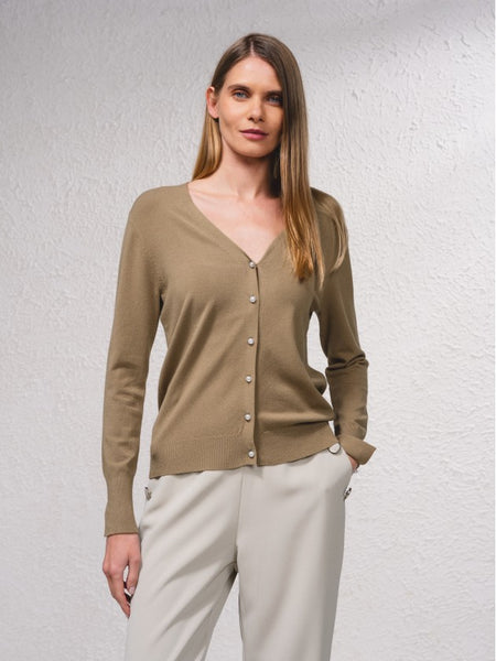 Chaqueta básica de punto, manga larga con puños abiertos y botones, escote en pico y cierre frontal con botones de perla.
