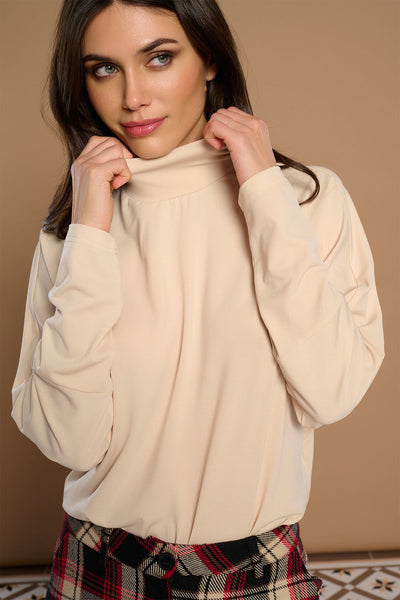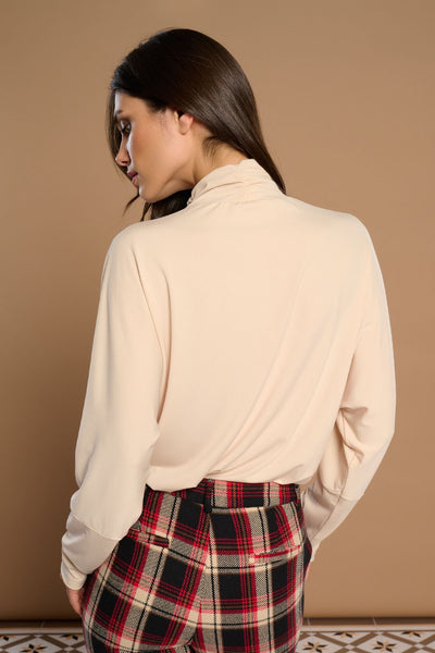 Blusa de cuello perkins plisado y manga larga. Manga larga. Tejido elástico.