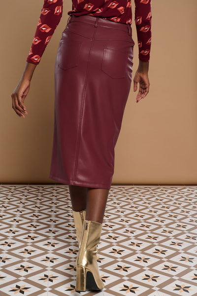 Falda midi de polipiel en color burdeos. Detalle de labios bordados en lateral derecho. Abertura frontal. Cierre con cremallera y botón frontal. Bolsillos delanteros y traseros. Forro interior.