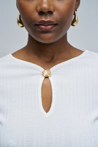Esta jersey de punto fino acanalado es un básico sofisticado para tu armario y destaca por el detalle de abertura en el pecho. El corte slim realza la silueta, asegurando un look femenino y moderno. Versátil y atemporal, es perfecta para cualquier ocasión.