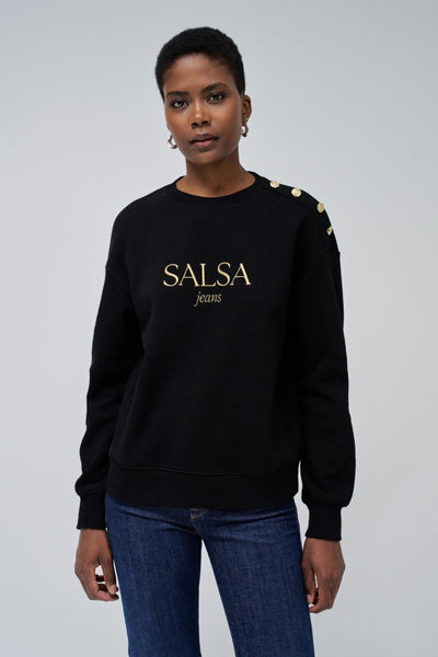 Sumérgete en la comodidad de este jersey de felpa negro, con un elegante corte regular y cuello redondo. Las mangas largas con puños acanalados proporcionan un ajuste cómodo, mientras que los botones dorados en el hombro añaden un toque sofisticado. El detalle de branding completa el diseño, convirtiendo esta pieza en esencial para un look casual y moderno.