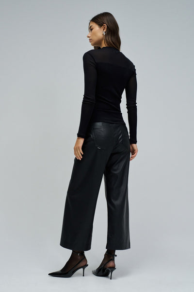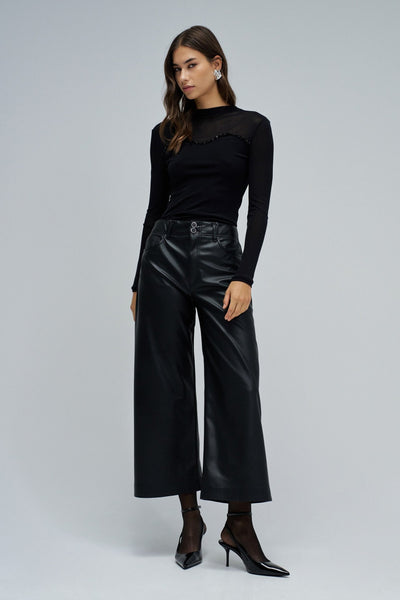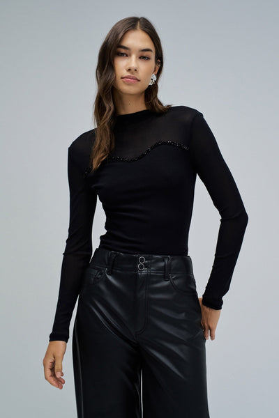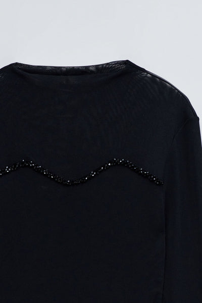 Esta camiseta de tul es la expresión discreta del glamour que marca la temporada festiva. Con un ajuste slim y cuello alto, dibuja una silueta elegante y femenina, mientras que las mangas largas y el juego de transparencias revelan solo lo esencial. Las aplicaciones de tul añaden un toque sofisticado, haciéndola perfecta para las noches en las que cada detalle cuenta. Una prenda versátil que se transforma según el momento. Combínala con una falda o con pantalones de efecto piel para crear un look especial y magnético. Porque en esta época, el brillo está tanto en la actitud como en el outfit.