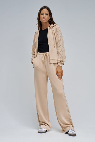 Sudadera con cremallera en tono rosa viejo, que combina comodidad y un toque de brillo discreto gracias a la aplicación de lentejuelas en las mangas largas. Con corte regular, presenta un práctico capucha y acabados en puños acanalados, garantizando un estilo moderno y versátil para el día a día.