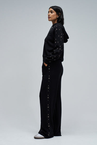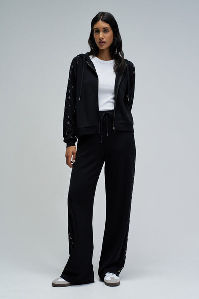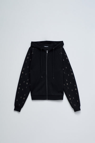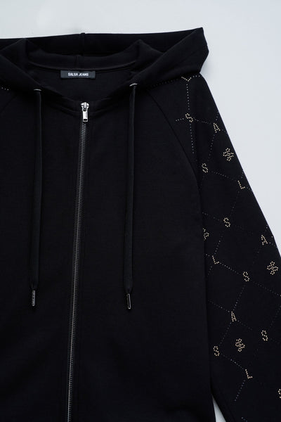 Sudadera con cremallera en tono negro, que combina comodidad y un toque de brillo discreto gracias a la aplicación de lentejuelas en las mangas largas. Con corte regular, presenta un práctico capucha y acabados en puños acanalados, garantizando un estilo moderno y versátil para el día a día.