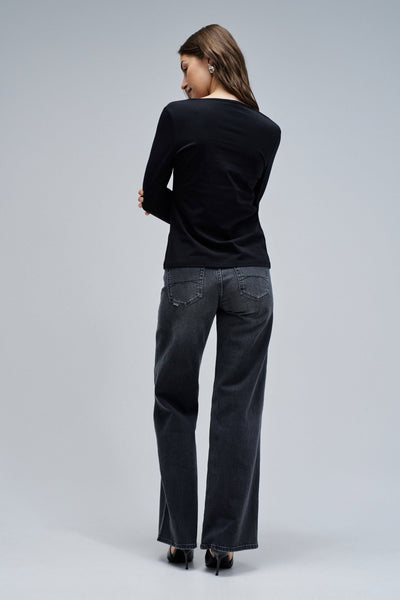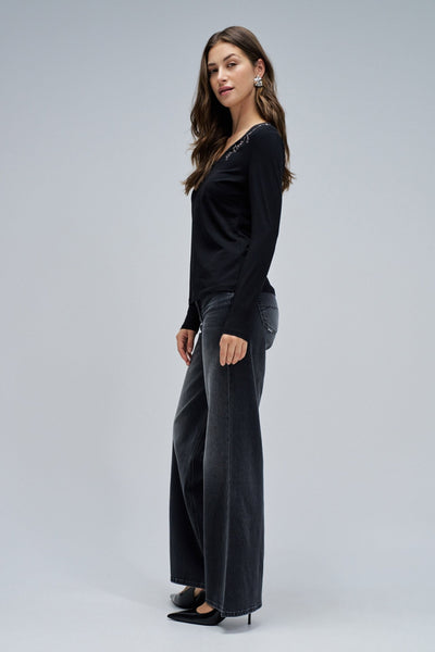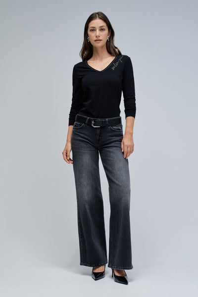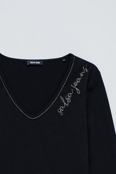 Jersey de punto negro, con corte slim que realza la silueta. El escote en V con aplicaciones brillantes aporta un toque sofisticado, mientras que el branding con detalle luminoso añade modernidad. De manga larga, es una prenda versátil que combina comodidad y estilo, perfecta para looks casuales con un toque de elegancia.