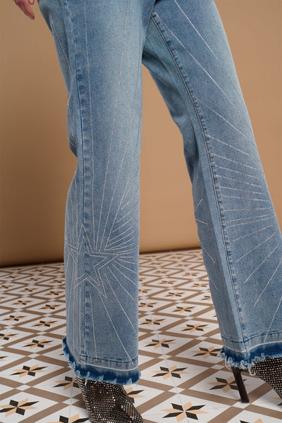 Jeans de tiro alto con bolsillos de plastrón delanteros y bajo acampanado. Detalle de estrellas y lineas en strass.