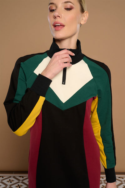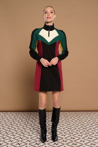 Vestido corto de mezcla de algodón con estampado color bloc. Cuello perkins con cremallera y manga larga. os colores