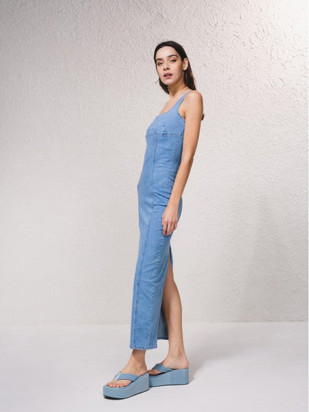 Tela de algodón tipo ganga. Dibujo largo. Dibujo regular. Asas anchas y escote recto. Sin mangas. Cierre trasero. Costuras decorativas.