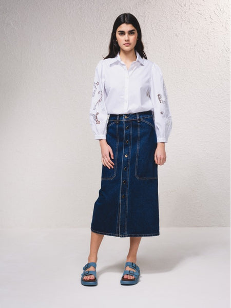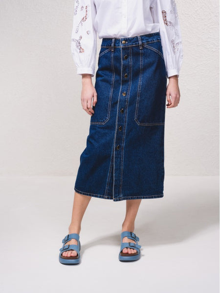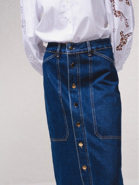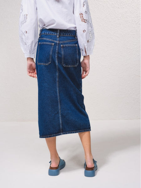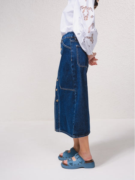 Falda vaquera midi, corte recto, cuatro bolsillos y cinturilla con trabillas, cierre y abertura con botones frontales.