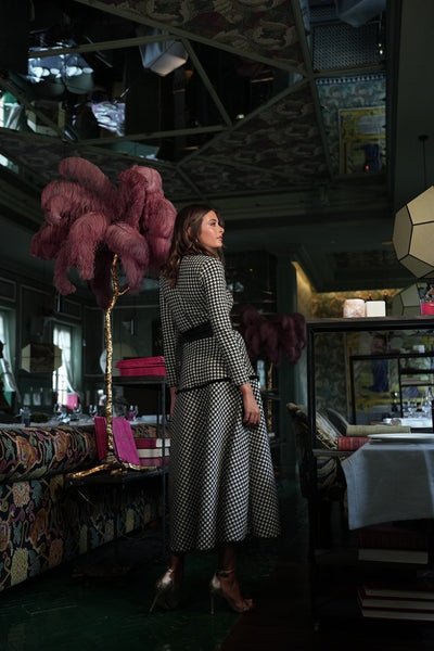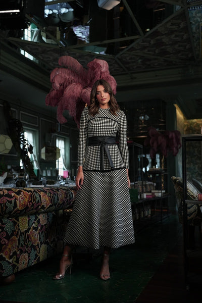 Este vestido de invitada midi está confeccionado en un tejido de punto grueso elástico con estampado en pata de gallo. El fajín satinado marca la cintura aportando estructura y un toque de distinción, mientras que la falda larga aporta movimiento y equilibrio visual. Detalle vivo flecos. Cierre cremallera invisible en espalda.