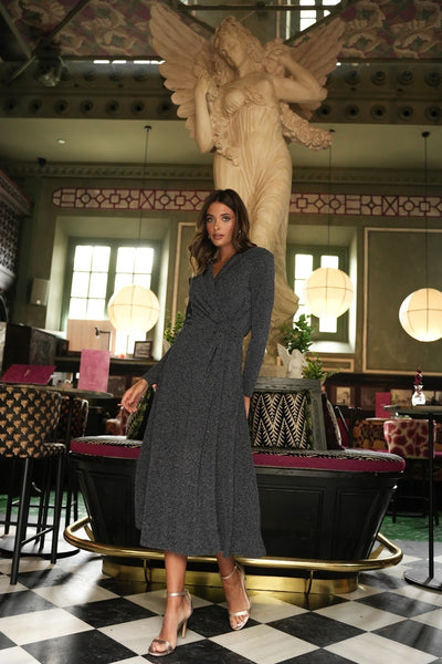 Este vestido gris midi de invitada de Cayro Woman, está confeccionado en tejido de punto con brillo sutil que envuelve la figura con una caída fluida y sofisticada. Detalle cintura para sujetar el escote con diseño cruzado, realzando las curvas de forma natural. Escote en pico y manga larga. Cierre con cremallera invisible.